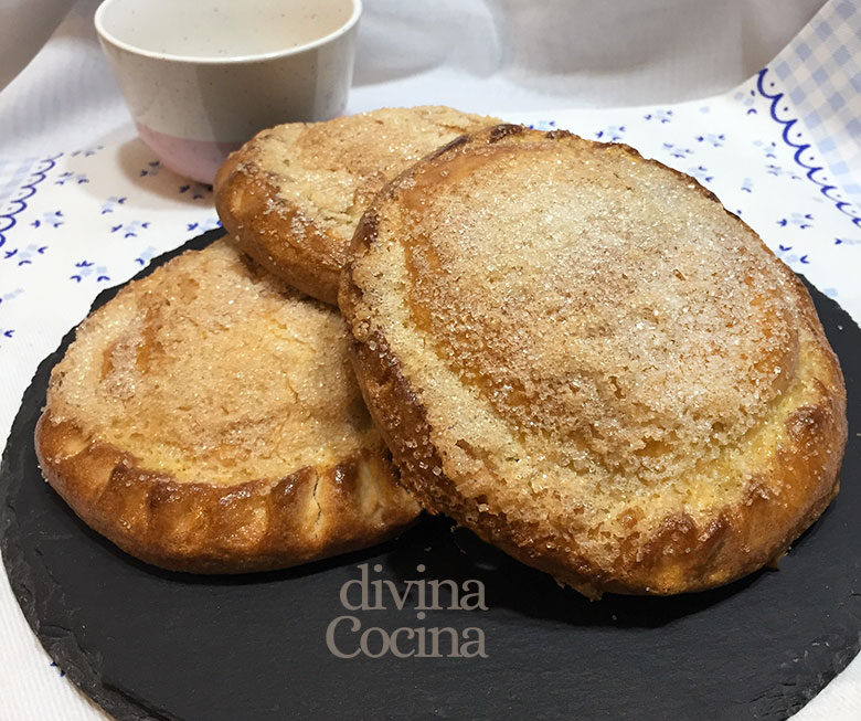- Horneamos a 250 °C unos 20 minutos hasta que empiecen a dorarse. Los sacamos, pincelamos con el huevo batido y espolvoreamos azúcar por encima. Volvemos a meter al horno hasta que se dore del todo.