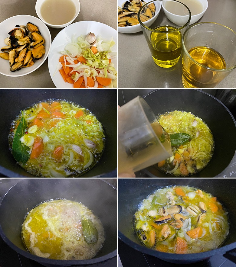 Llevamos a ebullición unos minutos para que evapore la acidez del vinagre y se enternezcan un poco las verduras. Incorporamos al final el caldo de cocción de los mejillones.