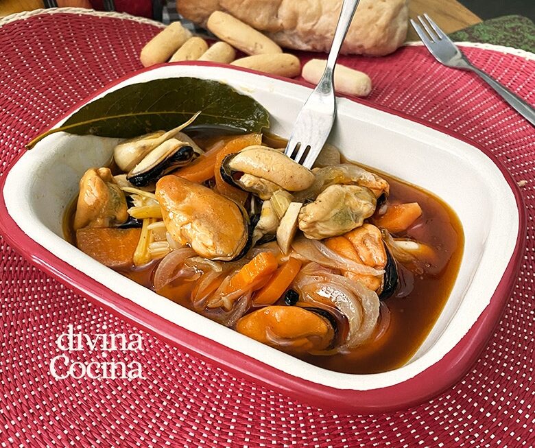 Los mejillones en escabeche de lata se pueden ‘tunear’ preparando este escabeche que te proponemos y sumergiendo después los mejillones en escabeche de conserva en la salsa. Al presentarlos los acopañas con las verduras y escabeche casero.