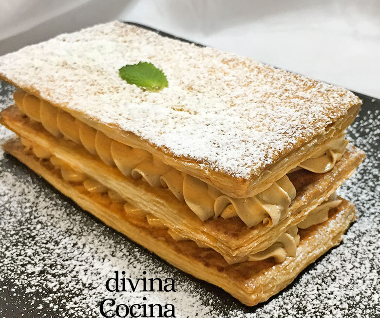 Esta receta de milhoja de moka y hojaldre se prepara con hojaldre refrigerado, así que mientras se hornea el hojaldre puedes preparar la moka y listo. Tienes un postre sencillo y especial en lo que tardas en hornear el hojaldre.