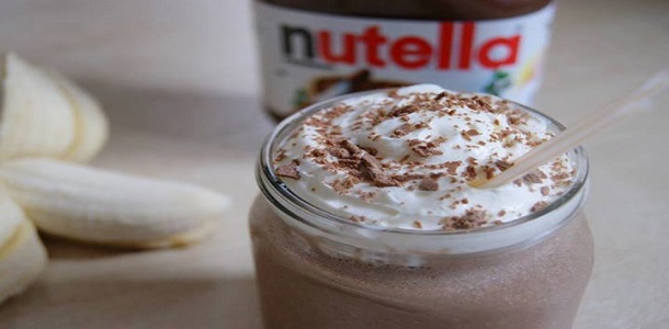 Bata o sorvete com o leite e Nutella no liquidificador. Despeje a bebida em um copo alto decorado com a cobertura e salpique com avelã picada por cima. Sirva em seguida.