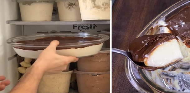 En un recipiente coloque el chocolate picado y se derrite en el microondas, de 30 en 30 segundos, siempre moviendo para que no se quema. ¡O se derrite en baño maría! Luego coloque la crema de leche y mezcle hasta que quede homogénea. Despeje la cubierta por encima de la crema blanca que reservamos en la nevera. ¡Deje en la nevera por un promedio de 4 horas!