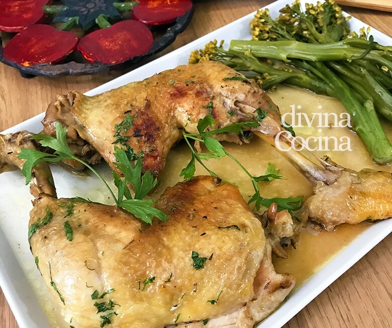 - Horneamos en la parte media unos 45 minutos bajando a 180º. A mitad de cocción subimos a 200º, damos las vuelta a los muslos y regamos con los jugos de la bandeja, añadiendo agua si es necesario para que no se resequen. Si ves que se doran demasiado en cualquier momento puedes cubrir con papel aluminio.
