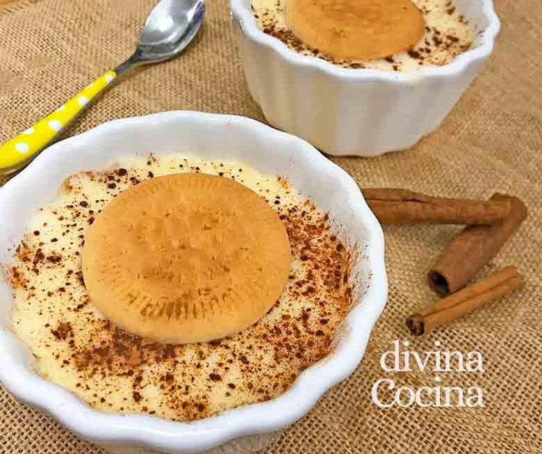 6. Ya están listas y podemos ponerlas en vasitos o cazuelitas de servicio. Espolvoreamos las natillas con un poco de canela en polvo y ponemos una galleta en la superficie.