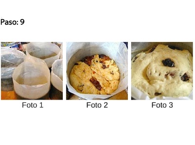 Acomodamos la masa en bolsitas de papel que venden especialmente para Pan Dulce o en un molde circular previamente enmantecado y enharinado. Rodeando el molde con papel manteca enmantecado. Foto 1.