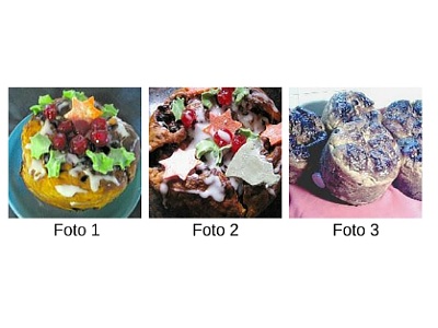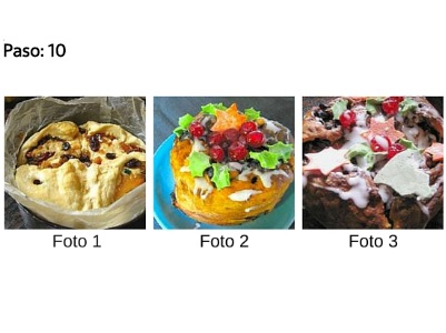 En el momento de comerlos se decoran a gusto con frutos secos, cerezas rojas y verdes, con fondant o hilitos de chocolate y se pintan con jalea caliente. Foto 2 y 3.