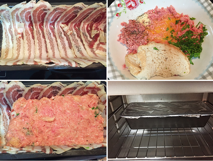 - Engrasamos un molde de plum-cake con un poco de mantequilla y lo forramos muy bien con una capa de lonchas de bacon colocadas superpuestas. Damos forma alargada a la carne y la vamos colocando en el molde bien prensada.