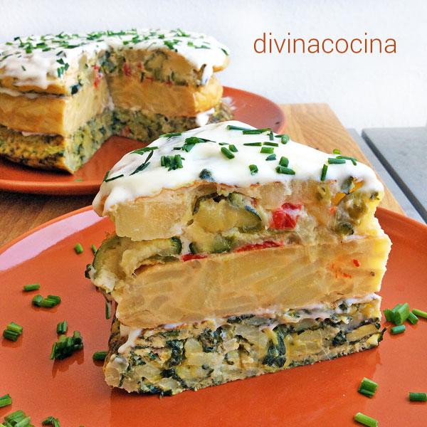 Los INGREDIENTES de este plato son 3 tortillas variadas en ingredientes y con forma similar, que se superponen unidas con alguna salsa. Para 6 personas hay que preparar 3 tortillas de 3 huevos cada una.