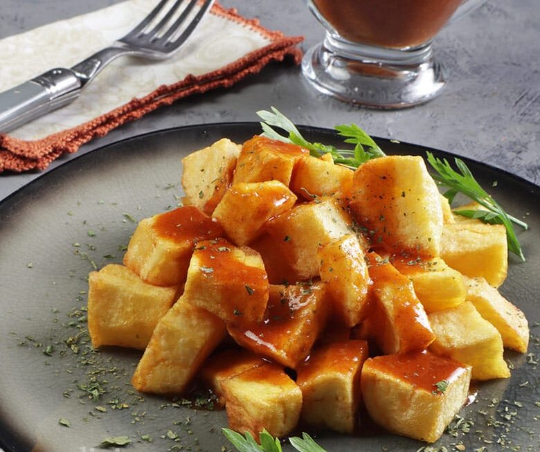 Las patatas deben estar recién fritas, doradas y crujientes. Salseamos generosamente con la salsa brava bien caliente y servimos al momento.
