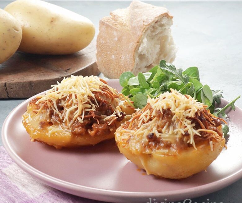 - La vaciamos con una cucharita (guarda esa patata para purés o cremas) y cortamos un poquito la base para que se asienten. Rellenamos con la boloñesa, cubrimos con bechamel y con queso rallado y gratinamos bajo el grill hasta que doren. Servimos las patatas rellenas de carne al momento, bien calientes.