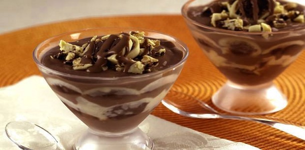 Para a montagem, em um refratário ou taças individuais, alterne camadas de creme e bombons picados.