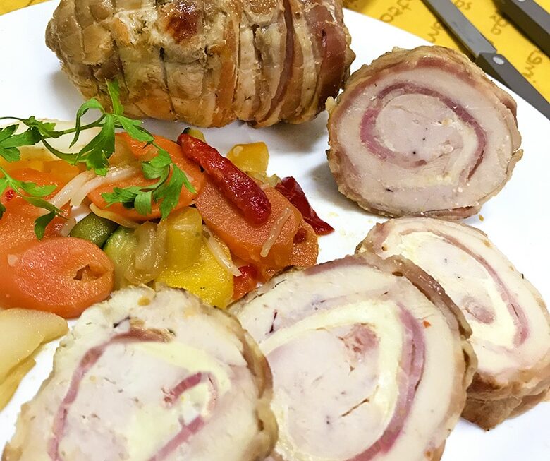 - Para servir las pechugas envueltas en bacon, cortamos en rodajas y acompañamos con la salsa que ha soltado en el horno. La salsa se puede reducir al fuego para espesarla un poco si es necesario. El plato se puede servir también en frío.