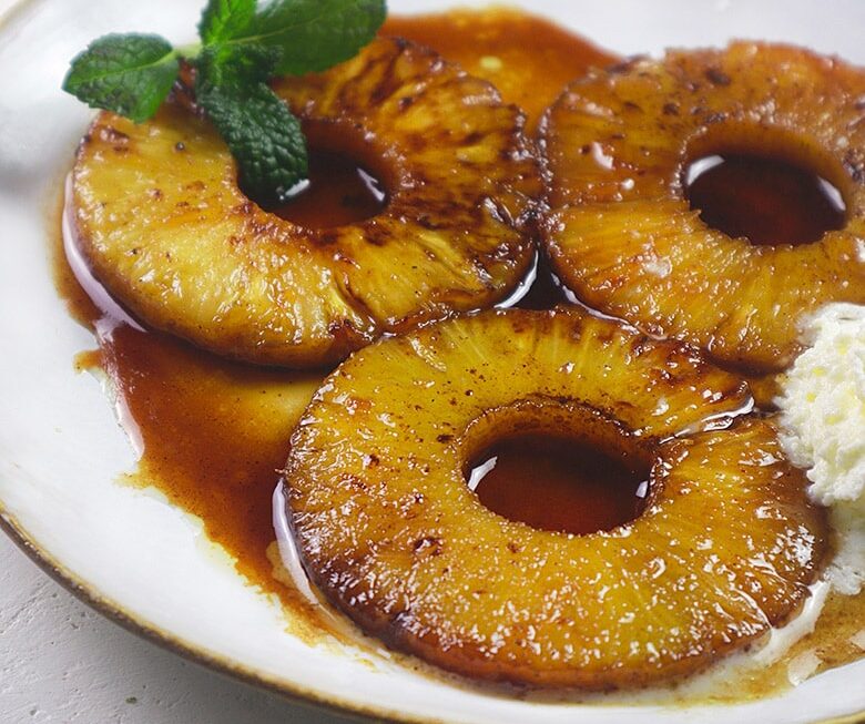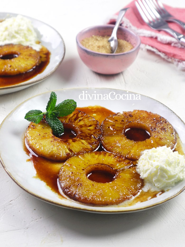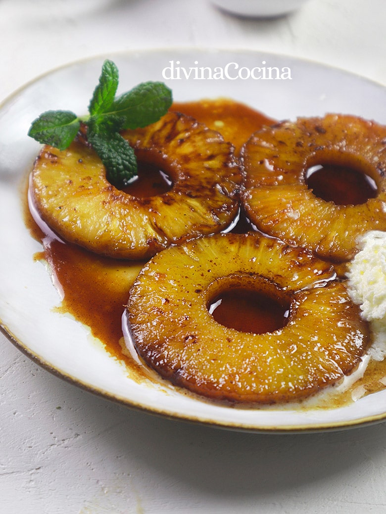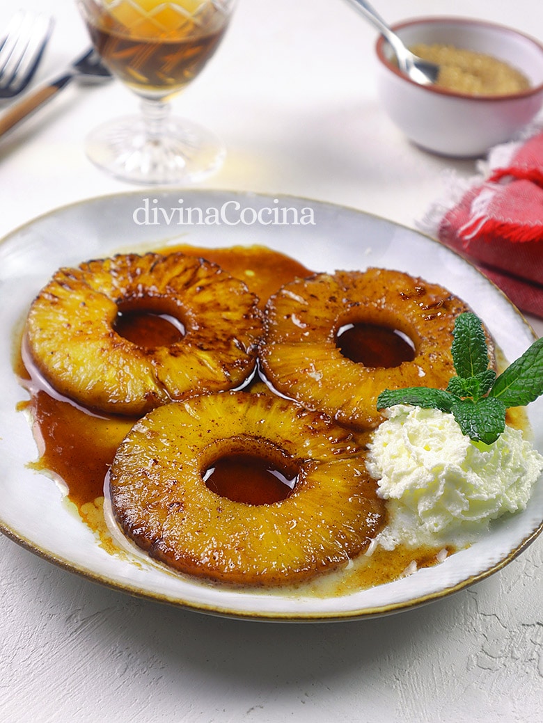 - Servimos la piña asada al momento, caliente o templado, y decoramos con nata montada o unas hojitas de menta.