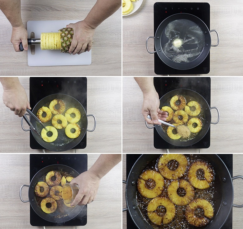 - En una sartén ponemos la mantequilla y cuando se derrita añadimos ñas rodajas de piña, dándoles la vuelta para que se impregnen bien y vayan dorando.