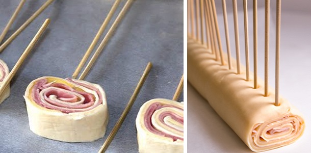 Preparación de las piruletas de jamón y queso con hojaldre: