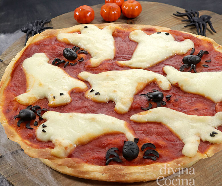 ↓↓ VER VÍDEO RECETA de Pizza Halloween con fantasmas y arañas ↓↓