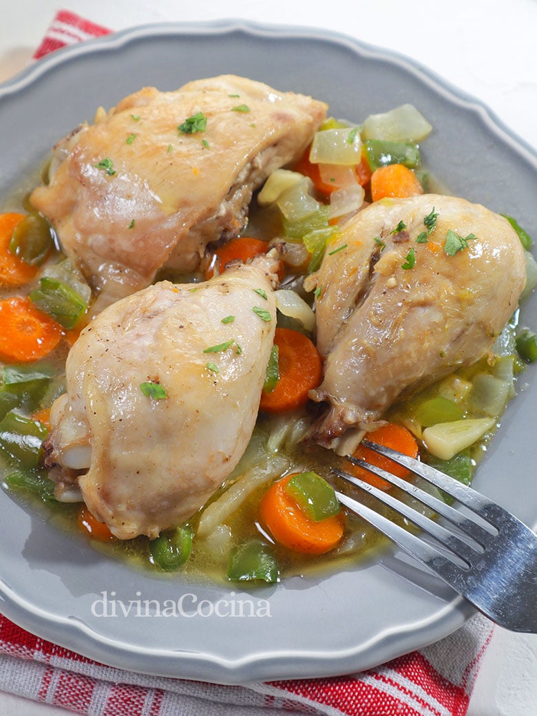 - Si quieres hacerlo en olla a presión serán unos 10 min. aunque a mi entender no merece la pena porque el pollo enternece rápido y tiene más sabor con la cocción lenta.