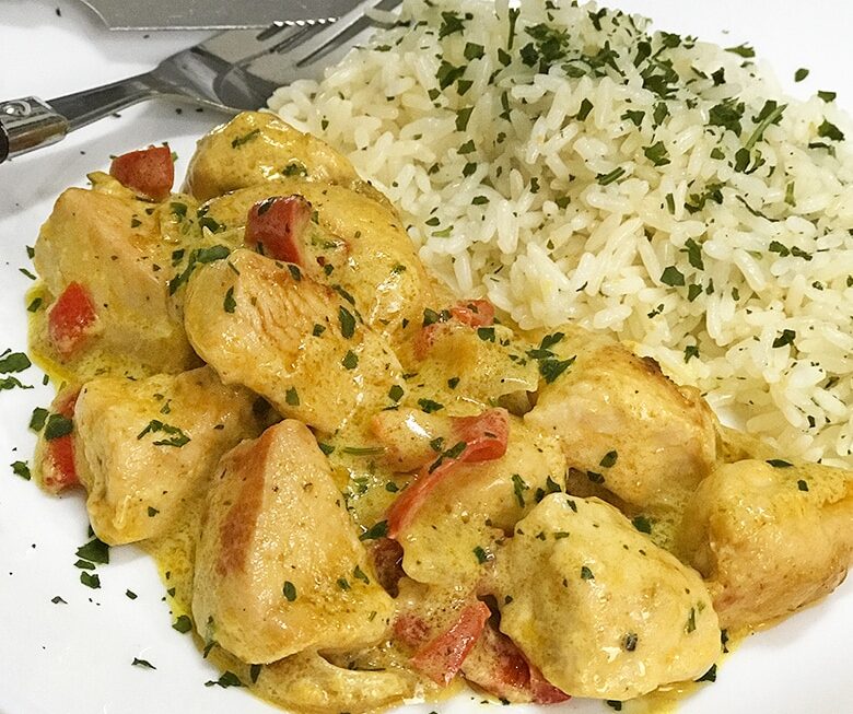 Esta receta de pollo al curry es muy sencilla y rápida. La salsa a base de crema de leche resulta muy suave y untuosa, con notas aromáticas.
