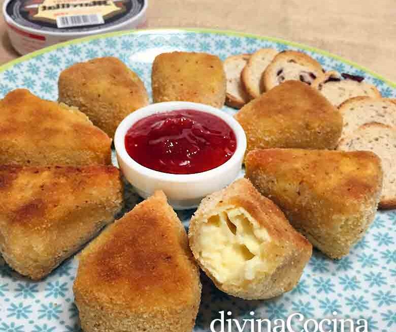 - Cortar el queso recién sacado de la nevera (insistimos en que debe estar bien frío y duro) en trozos regulares, los rulos en piezas de 2 cm aprox. y el camembert o brie en triángulos o rectángulos. En las fotos del paso a paso hemos usado triángulos de camembert.