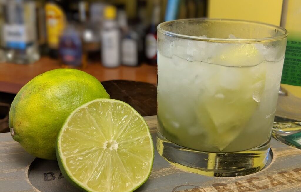 Ingredientes: 1 lima (cortada en trozos pequeños), 2 cucharaditas de azúcar (ajusta según tu preferencia de dulzor), 2 oz (60 ml) de cachaça (una aguardiente brasileña hecha de caña de azúcar), Hielo picado, Rodaja de lima para decorar (opcional).