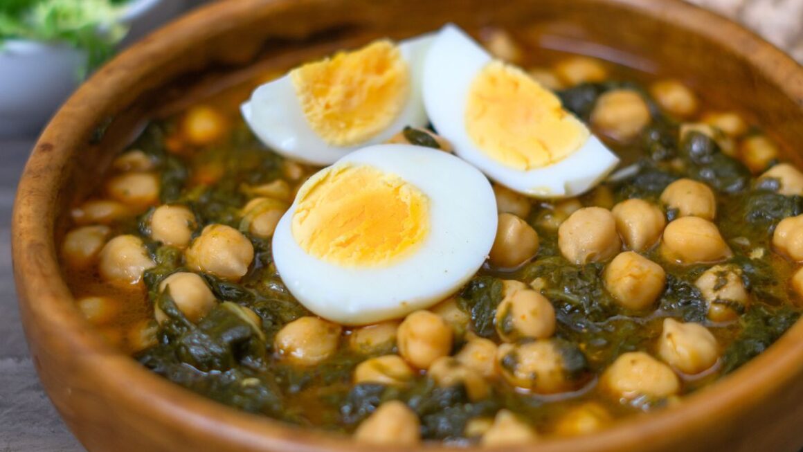 El guiso de garbanzos con espinacas y huevo hervido es un plato que combina lo reconfortante de los garbanzos, la frescura de las espinacas y la suavidad del huevo para crear una experiencia culinaria equilibrada y deliciosa. El guiso en sí es una sinfonía de ingredientes. Los garbanzos, cocidos a la perfección, aportan una textura firme y satisfactoria, mientras que las espinacas añaden un toque de frescura y nutrientes. La cocción lenta en la mezcla de especias y caldo infunde cada elemento con los sabores aromáticos del comino, el pimentón y la cúrcuma, si se ha utilizado. La inclusión de huevos hervidos agrega una capa adicional de cremosidad y proteína al plato. Cortados por la mitad, los huevos revelan sus yemas suaves y doradas, que se mezclan armoniosamente con el guiso al romperse. La combinación de sabores es compleja pero bien equilibrada. La acidez de los tomates y el toque terroso de las espinacas se contrarrestan con la suavidad de los garbanzos y la cremosidad del huevo. El conjunto se ve realzado por el toque cítrico del limón, si se ha utilizado, que aporta frescura y resalta los sabores. Aquí tienes una receta mejorada de guiso de garbanzos con espinacas, esta vez incluyendo huevo hervido: