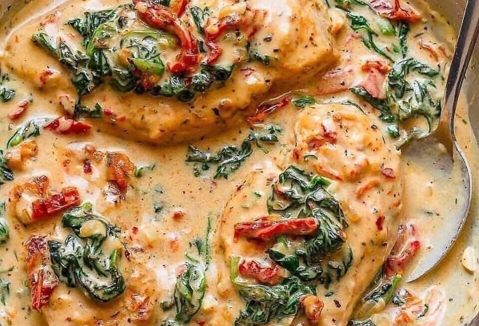 Preparación: Preparación del Pollo: Sazona las pechugas de pollo con sal y pimienta al gusto. Calienta el aceite de oliva en una sartén grande a fuego medio-alto. Cocina las pechugas de pollo hasta que estén doradas por ambos lados y completamente cocidas. Retira y reserva. Preparación de la Salsa: En la misma sartén, agrega más aceite si es necesario. Sofríe la cebolla y el ajo hasta que estén dorados y fragantes. Añade las espinacas y cocina hasta que se marchiten. Incorpora los tomatitos cherry y cocina por unos minutos hasta que comiencen a ablandarse. Deglasado con Caldo de Pollo: Vierte el caldo de pollo en la sartén para deglasear, raspando los fondos para aprovechar los sabores. Reduce el fuego a medio y deja que la mezcla hierva a fuego lento durante unos minutos. Añadir la Crema y Queso Parmesano: Vierte la crema espesa en la sartén y mezcla bien. Agrega el queso parmesano rallado y remueve hasta que la salsa tenga una consistencia suave. Regresar el Pollo a la Sartén: Coloca las pechugas de pollo cocidas de nuevo en la sartén, sumergiéndolas en la salsa. Cocina a fuego lento durante unos minutos para que el pollo se impregne con los sabores de la salsa. Servir: Sirve el pollo con la salsa de espinacas y tomatitos cherry por encima. Decora con hojas de albahaca fresca si lo deseas. ¡Listo! Ahora puedes disfrutar de un delicioso pollo con una salsa rica y llena de color, perfecta para acompañar con arroz, pasta o tu guarnición favorita.