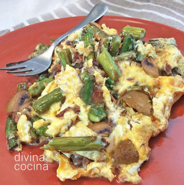 Lo más importante de este revuelto de setas y espárragos es controlar los puntos de cocción de las verduras. Si quieres asegurarte que no queden demasiado duras puedes también darles un hervor por separado en muy poca agua con sal hasta que comiencen a enternecer y después las escurres muy bien y pasas al salteado. De esta forma siempre quedarán al punto pero en el agua de la cocción se va una parte de sus propiedades y sabor.