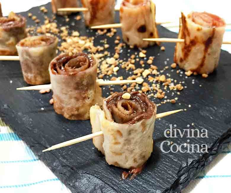 Estos rollitos de crepes rellenos son un bocadito sencillo para improvisar picoteos dulces, y se pueden rellenar a tu gusto con mermeladas o cremas de chocolate.