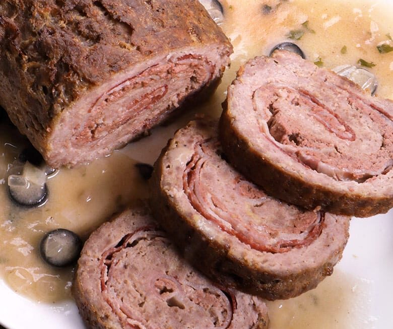 - Es mejor cortar el rollo de carne picada cuando haya enfriado un poco y esté templado para que no se deshaga. Lo servimos salseado con la salsa de aceitunas negras bien caliente.