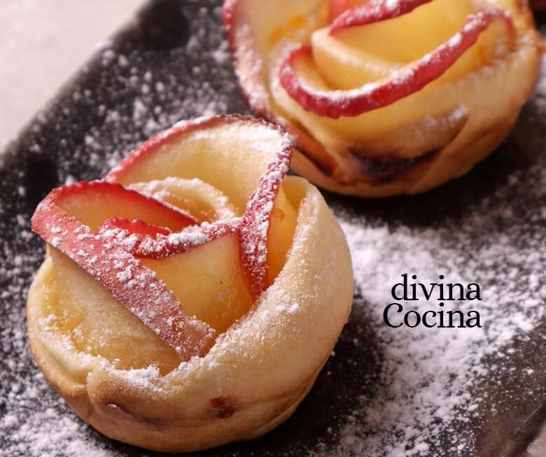 En la foto inferior las rosas de manzana se han preparado con masa de hojaldre. Puedes usarla y se sigue el mismo procedimiento, pero ten en cuenta que la masa de hojaldre crece mucho en el horno así que pon una tira bien fina y estirada con el rodillo.