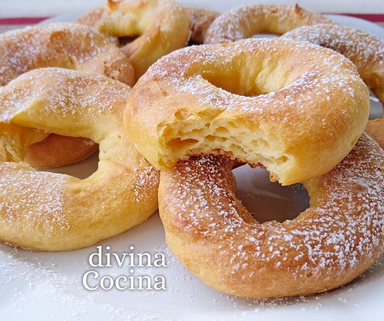 Estos roscos de natillas llevan un horneado rápido, pero son facilísimos de preparar, porque usamos para la masa natillas envasadas. Como resultado, unas rosquillas ligeras, con sabor a vainilla, suaves y esponjosas.