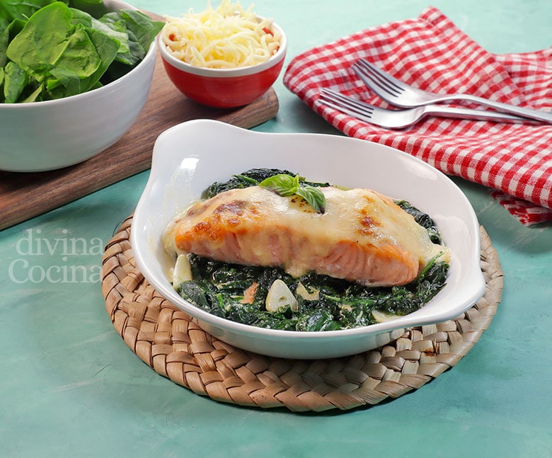 - En una fuente de horno ponemos un fondo de espinacas salteadas, encima las rodajas (sin pieles) o los lomos de salmón , y cubrimos con la salsa bechamel y un toque de queso rallado suave para gratinar.
