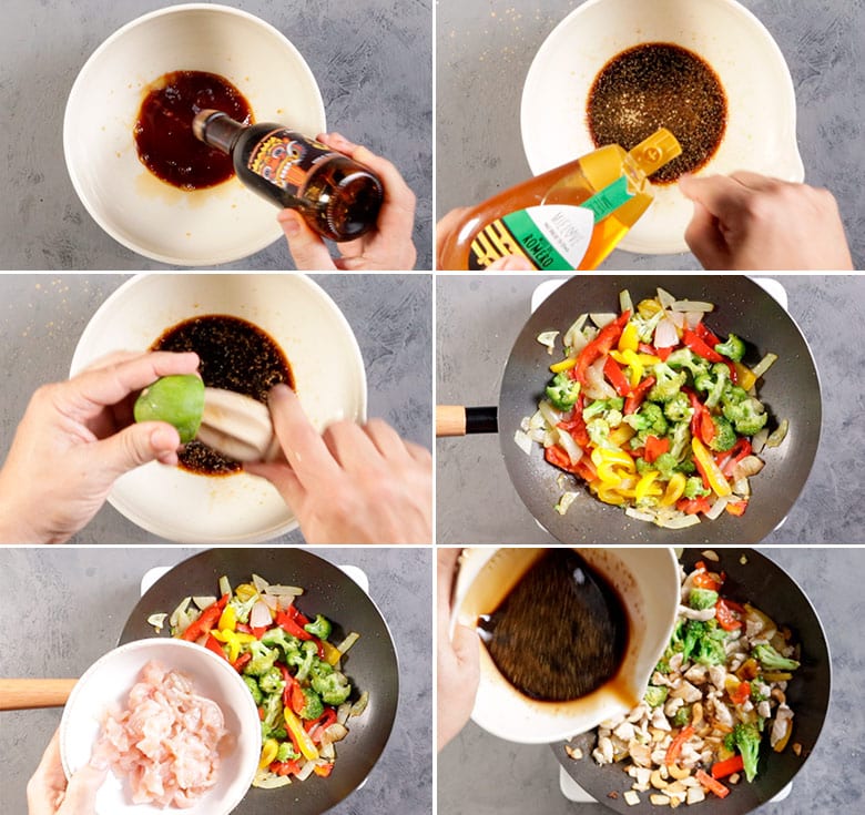 4. Mientras tanto, preparamos la salsa mezclando todos los ingredientes. Cuando el pollo esté cocinado y haya tomado un poco de color agregamos los anacardos y la salsa. Damos unas vueltas para que todos los ingredientes se impregnen bien con los aromas y sabor de la salsa.