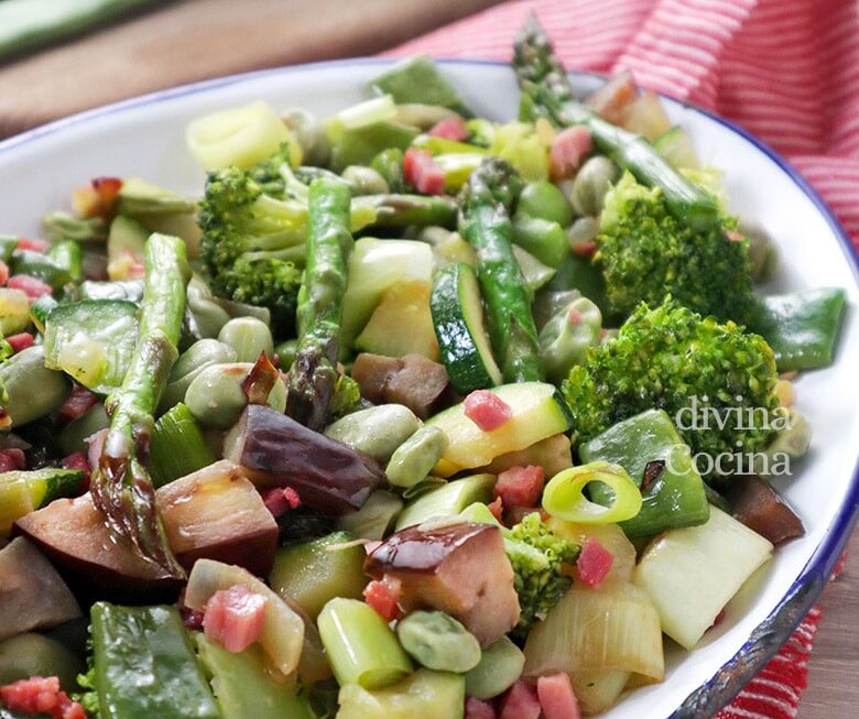 Esta receta de salteado de verduras con jamón se prepara con productos frescos de temporada y resulta un plato ligero, sano y sabroso.