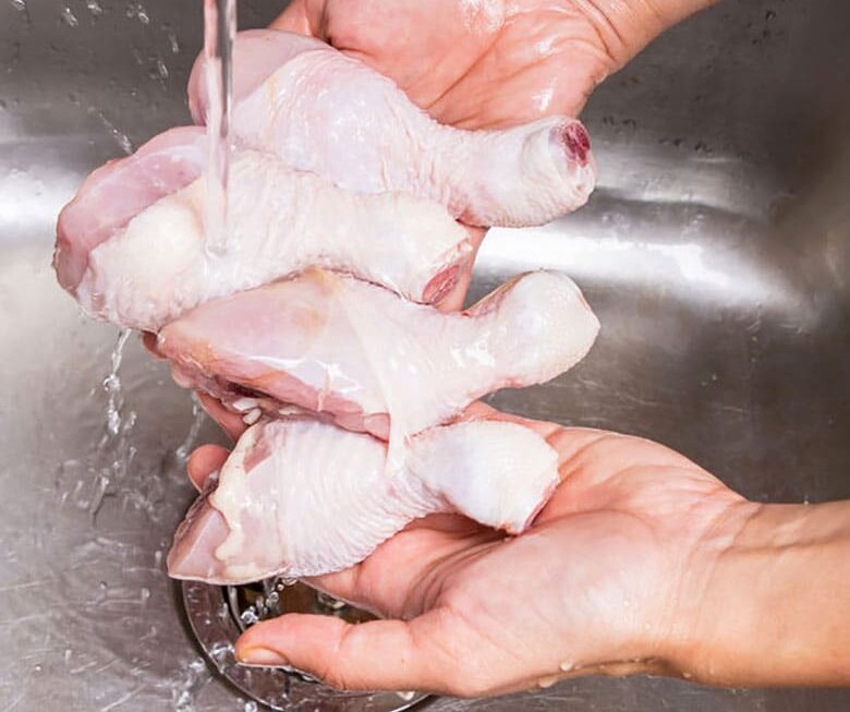 Según un estudio de la Universidad de Drexel en Filadelfia, confirmado en España por la OCU en 2016, al lavar el pollo crudo con agua no se eliminan las bacterías. Al contrario, lo que ocurre es que se extienden con las salpicaduras al fregadero, a los utensilios de cocina y a todo el radio de acción en el que estemos trabajando. Esto se hace extensivo al pavo y en general a otras aves.