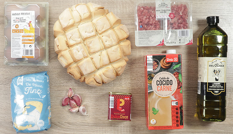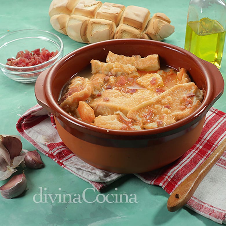 - Freímos los ajos en aceite de oliva, cortados grandes, y cuando ya estén dorados ponemos el jamón y el pimentón. Sin que llegue a freír, añadimos el pan troceado o cortado en rebanadas. Removemos. Vamos añadiendo caldo y dejamos cocer hasta que esté en su punto.