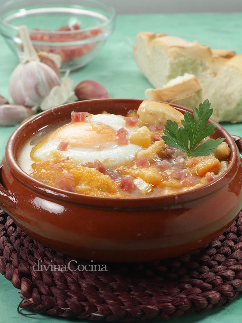 - Otra forma de hacer la sopa es poner el caldo con el sofrito, cuajar los huevos en el caldo, y llevar el pan a una olla de barro o una cazuela. Sobre el pan ponemos el huevo con cuidado para que no se rompa y entonces vertemos el caldo caliente por encima.