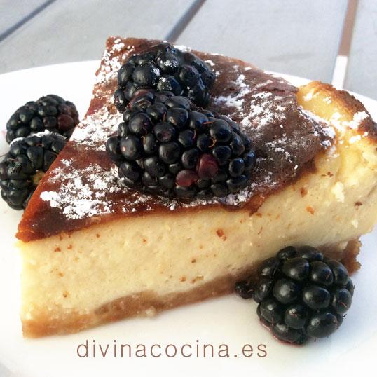 Esta tarta de queso americana (American Cheesecake) puede decorarse con bayas o frutos silvestres, con fresas, con mermeladas… En la foto está espolvoreada con azúcar glas y unas moras silvestres.