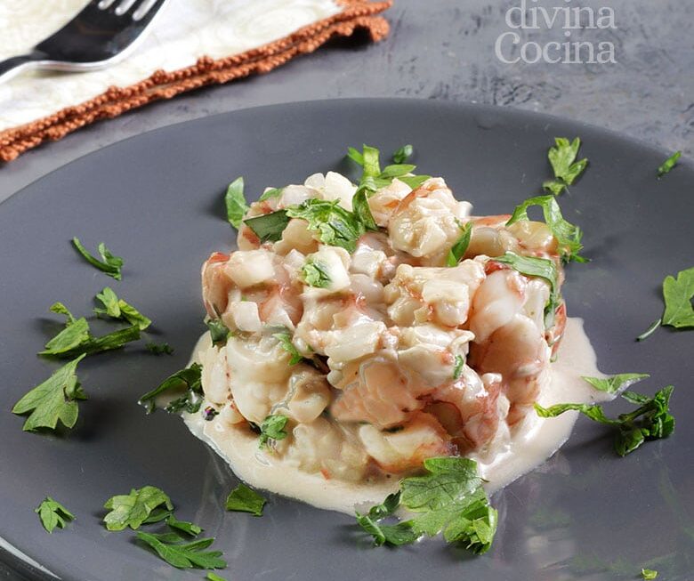 Podemos acompañar el tartar de langostinos con un aguacate picado, o mezclar el aguacate en el interior del tartar.