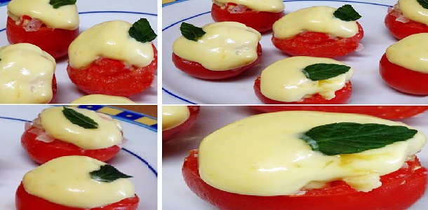 Mezclamos mayonesa con mostaza y miel y cubrimos los tomatitos con ella. Decoramos con una hojita de albahaca o menta.