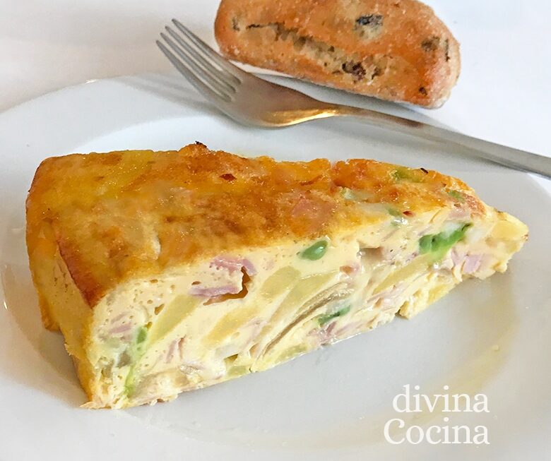 Esta receta de tortilla de patatas, puerros y jamón tiene una elaboración sencilla y una presentación muy ‘a la francesa, entre una tortilla tradicional y una quiche.