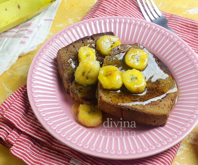Esta receta de tostadas de pan de plátano te va a conquistar. Un bizcocho exprés y un postre caliente y lleno de aromas y sabor.