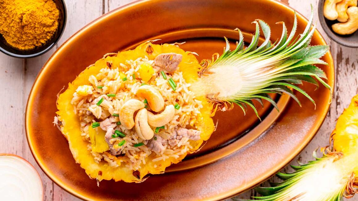 Hoy vamos a preparar un estupendo plato tailandés conocido como Khao Pad Saparod, o lo que es lo mismo, arroz frito con piña. Esta receta, es una variedad del tradicional de arroz frito oriental, con la originalidad de que se presenta dentro de media piña.