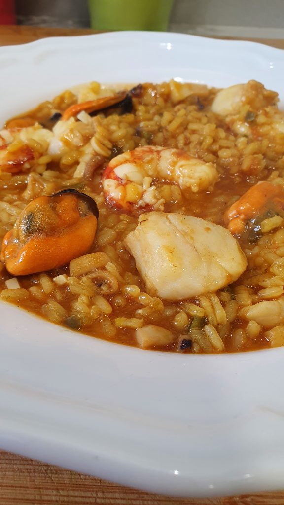 Ingredientes para preparar un ARROZ MELOSO de merluza y gambas: 250 gr. de arroz (bomba, redondo), 400 gr. de merluza (lomos), 300 gr. de sepia, 12 gambones, 12 mejillones, 2 tomates, 1/2 cebolla tierna, 2 dientes de ajo, 1/2 pimiento verde, Una cucharadita de pimentón dulce, Unas hebras de azafrán, Colorante alimentario, 1250 ml de caldo que prepararemos con las cabezas y cáscaras de las gambas.