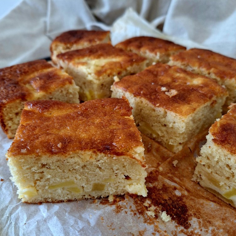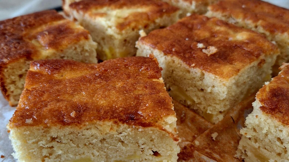 BIZCOCHO DE MANZANA 4X9. Ingredientes: 9 cucharadas de azúcar, 9 cucharadas de harina, 9 cucharadas de leche, 9 cucharadas de aceite de girasol, 1 sobre de levadura en polvo (15 gr), 3 huevos, 3 manzanas, 1 cucharada de azúcar moreno, El zumo de un limón, Molde de 24×21 cm.