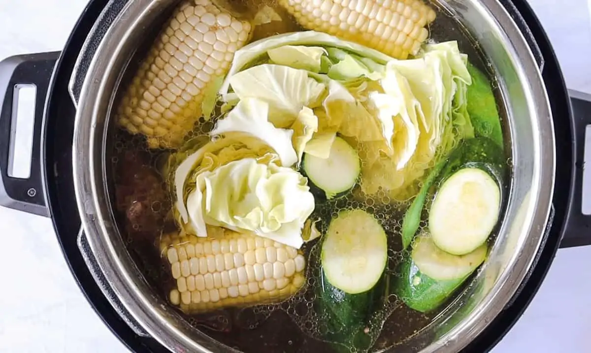 Agrega el maíz, las papas, las zanahorias, el calabacín, las judías verdes y el repollo a la olla instantánea. Si el líquido supera la línea de llenado máximo, retire un poco de líquido.