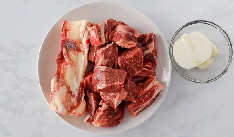 Agregue la carne cortada, los huesos, la cebolla, el ajo y la sal a la olla instantánea. Para darle más sabor puedes reducir la sal y agregar caldo de res. Llena la olla instantánea con 10 tazas de agua. Estas medidas son para una olla instantánea de 8 cuartos .