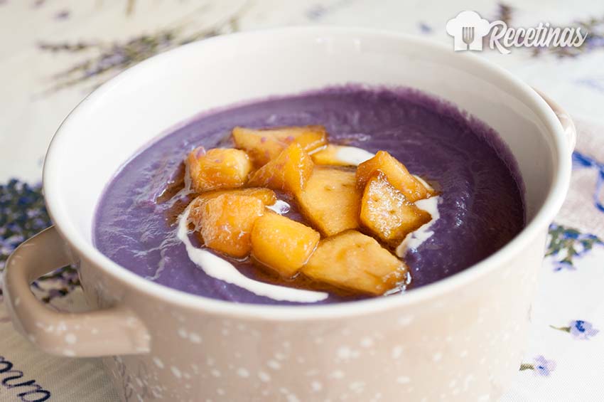 Servimos en un bol o plato la crema lombarda y la terminamos con un poco de nata por encima y los trozos de manzana bañados en azúcar. Un contraste buenísimo que seguro os va a encantar y además se puede refrigerar antes de consumir si te gusta más fresquita!.