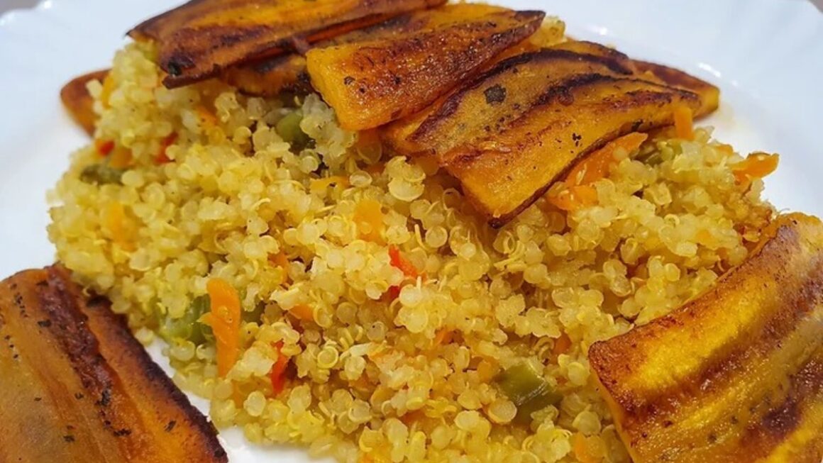 INGREDIENTES 3/4 taza de quinua Agua para remojar la quinua 1 y 1/2 taza de agua para cocinar 2 cucharadas de cebolla picada 1/4 cucharadita de cúrcuma en polvo 1/2 taza de zanahorias ralladas gruesas 1/4 taza de judías verdes rebanadas 2 cucharadas de pimiento rojo picado
