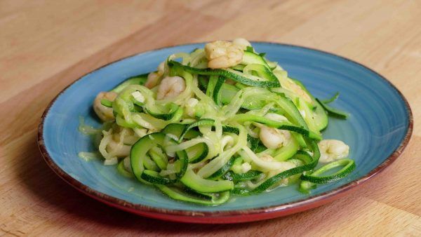 Espaguetis de calabacin con gambas. Los espagueti de calabacín son una alternativa sabrosa y saludable a los tradicionales de pasta, que cada vez es más conocida. El tiempo de cocinado es muy corto, si bien el corte requiere algo de preparación. En esta ocasión, vamos a prepararlos con gambas. Las gambas son ese recurso de sabor del mar que combina con casi todo, especialmente con las verduras y que va a dar mucho sabor a esta receta de espaguetis de calabacín con gambas, deliciosa y con muy pocas calorías.